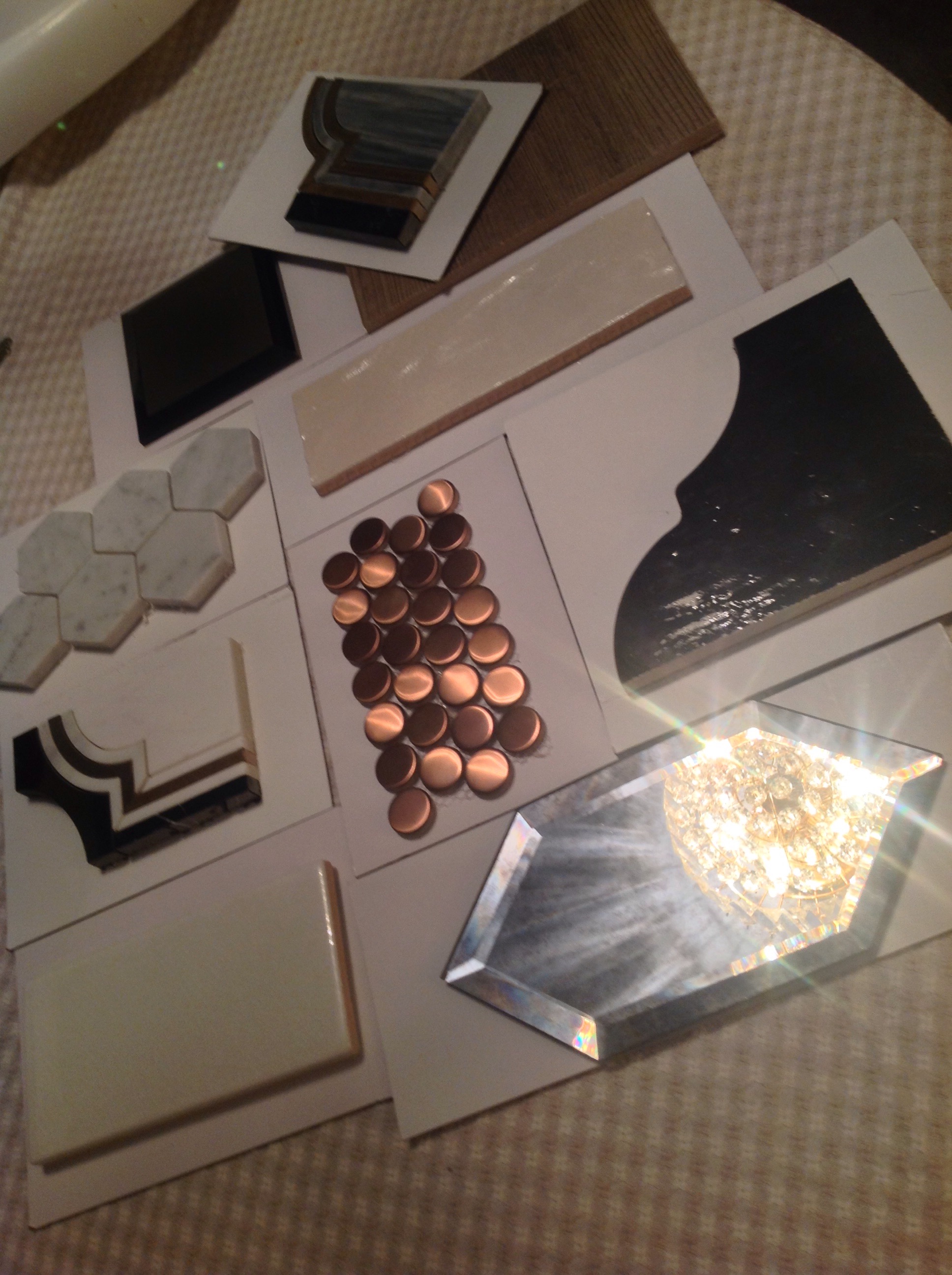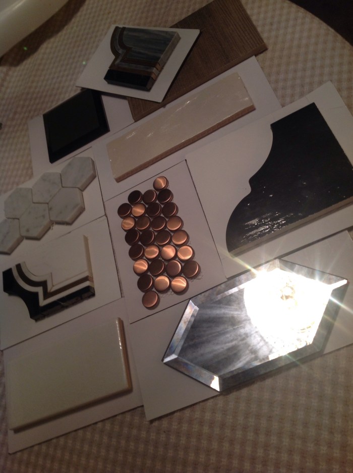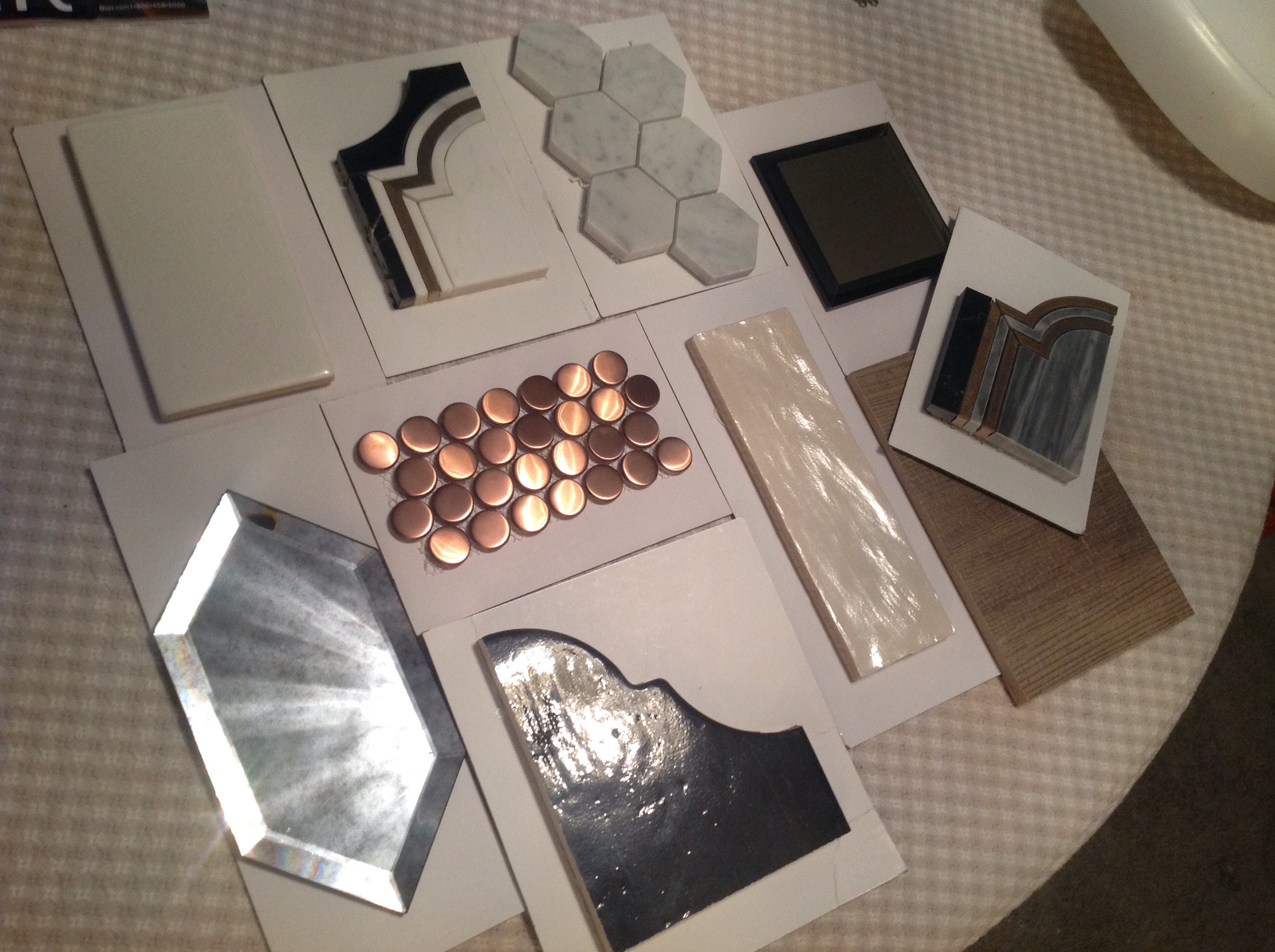 I was soooo preoccupied by the layouts forgot I needed to add finishes and tile. I had ordered a sample of some 12″x24″ turkish carrera marble. But after some thought I realized that might not be the best idea on the floors… marble is hella slippery when wet. I figured a smaller tile in the center would provide more traction with the grout covering more surface. I also would like to add a little brass detail to make it pop.