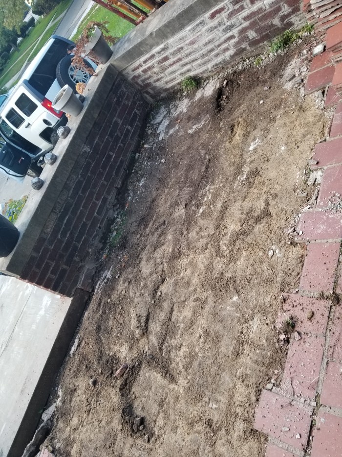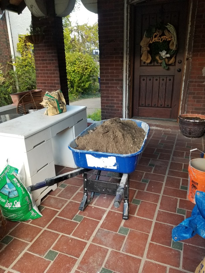 Working against time and other sabotaging forces I stripped the tile from the porch and started shoveling the mounds of sand some idiot put under a bad tile repair.