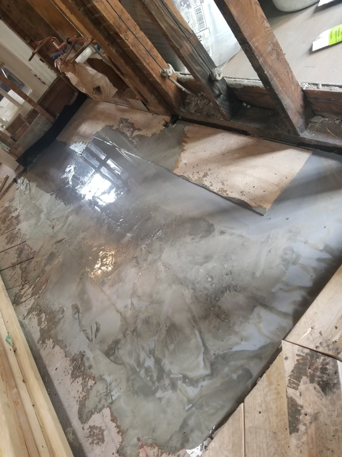 And to get a jump on the plumber stuff I poured the self leveler to level the floor for the cement board in the bathroom.